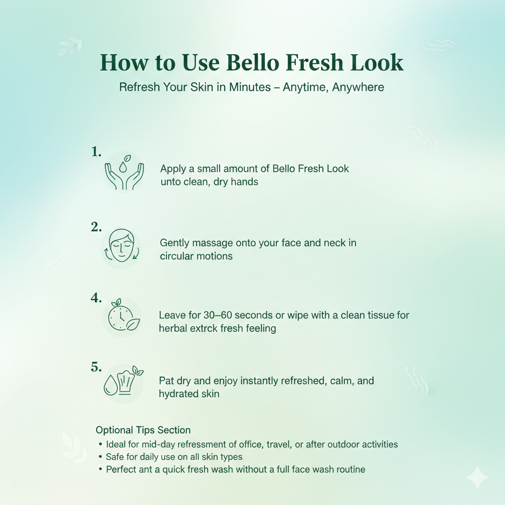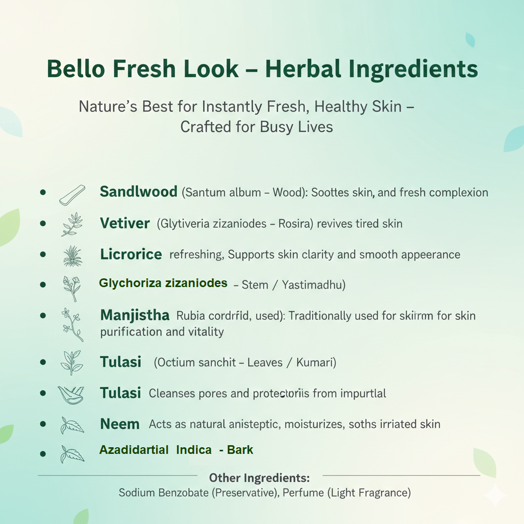 Bello Fresh Look is a gentle, soap-free herbal face wash formulated with equal proportions of aqueous extracts from time-tested Ayurvedic herbs. Specially developed for office-goers, travelers, and people exposed to pollution, it helps cleanse, refresh, and protect the skin without causing dryness.