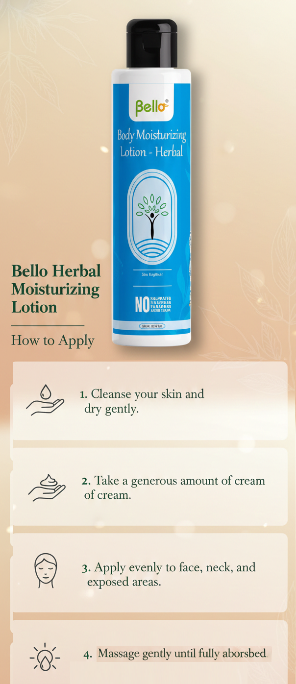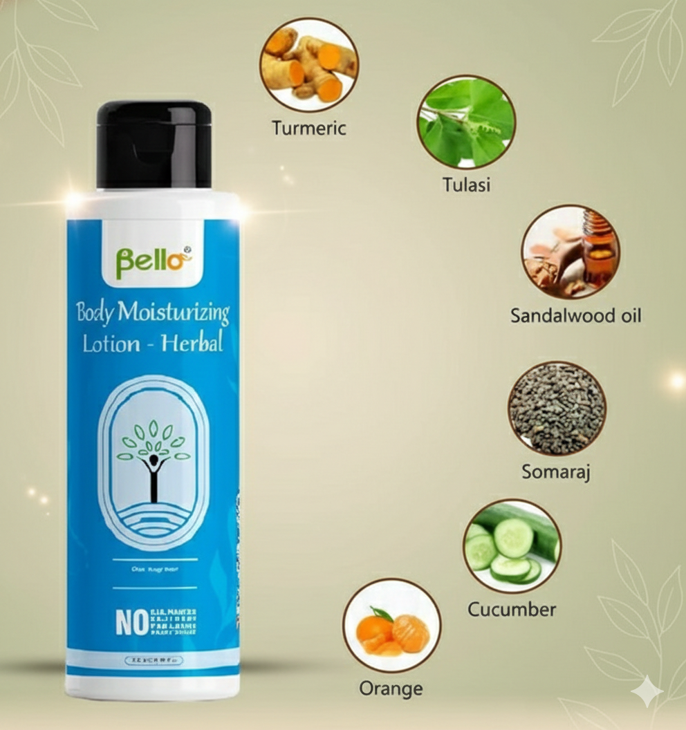 Bello Herbal Body Moisturizing Lotion is a gentle, daily-use herbal moisturizer designed to keep skin soft, smooth, and naturally radiant. Enriched with a blend of traditional botanical extracts, it helps hydrate the skin, soothe irritation, and restore its natural glow.
